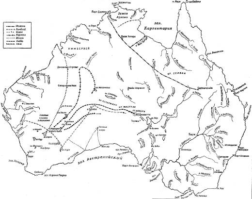 В 1878 г. Барклей исследовал реку Хэй и ее притоки к западу от квинслендской границы, а много лет спустя, в 1904 г.,— верховья реки Финк. Точно так же Линдсей в 1885–1886 гг. пересек область между реками Джорджина и Финк и между Финк и нижним течением реки Хэй. В 1891 г. он совершил более длинное путешествие от реки Алберга в западную пустыню, где он повернул на юг и прошел к озеру Кауэн в Западной Австралии. После этого он проследовал в северо-западном направлении через озеро Барли к реке Мерчисон. К северу от этого маршрута Титкинс в 1889 г. исследовал область между Элайс-Спрингс, озером Амедеус и озером Макдональд. Еще севернее в 1894 г. вышла крупная, хорошо оборудованная экспедиция Хорна с целью исследования местности между Уднадаттой и хребтом Мак-Доннелл. Интересы ее лежали скорее в области геологии и антропологии, чем чистой географии, но она дала новый ценный материал и по географии мало известных областей Центральной Австралии.