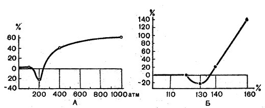 Рис. 10. Связывание нейтрального красного мышечными волокнами лягушки. А — при действии гидростатического давления. По оси абсцисс — давление, атм; по оси ординат — изменения окрашиваемости, %. Б — при растяжении. По оси абсцисс — длина волокна, % (за 100% принята длина в покое); по оси ординат — изменения окрашиваемости, %