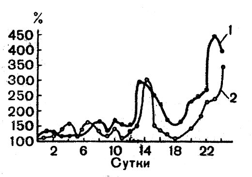 Фазное течение процесса проявляется в том, что направление изменений различных параметров меняет свой знак, несмотря на однозначно идущее нарастание внешнего воздействия. Ниже приведены некоторые экспериментальные данные, иллюстрирующие такой волнообразный характер изменения ряда параметров в ходе развития клеточной реакции.