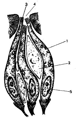Рис. 55. Схема строения вкусовой сенсиллы жука-полоскуна (Иванов, 1969): 1 — рецепторная клетка; 2 — централь-вый отросток; 3 — периферический отросток; 4 — оболочка; 5 — конус