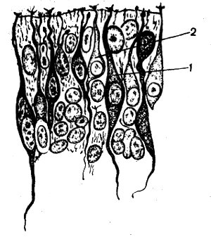 Рис. 56. Обонятельные клетки позвоночных (Винников, 1971): 1 — палочкообразная клетка; 2 — колбочкообразные клетки
