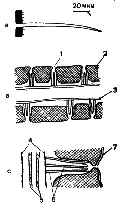 Рис. 57. Схема кутикулярного волоска в продольном разрезе (Steinbrecht a Kasang, 1972): a — общий вид; b — верхушка волоска с несколькими порами; c — одиночная пора; 1 — пора; 2 — кутикула; 3 — рецепторный отросток; 4 — рецепторная клетка; 5 — цитоплазматические микротрубочки; 6 — трубочки поры; 7 — внешний слой кутикулы