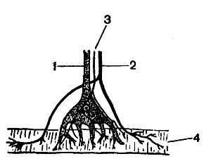 Рис. 58. Схема строения рецептора растяжения мышечных волокон рака: 1 — сенсорное волокно рецептора; 2 — моторное волокно; 3 — тормозное волокно; 4 — мышечное волокно