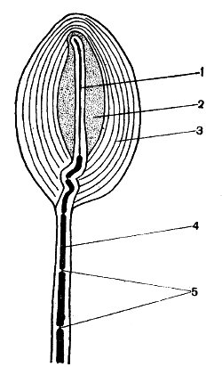 Рис. 59. Схема строения тельца Пачини: 1 — немиелинизированное нервное окончание; 2 — внутренняя колба; 3 — многослойная наружная капсула; 4 — миелинизированное нервное волокно; 5 — перехваты Ранвье