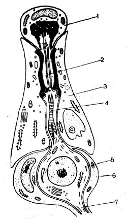 Рис. 60. Схема строения хордотональной сенсиллы тимпанального органа кузнечика (по Иванову, 1968): 1 — шапочковая клетка; 2 — видоизмененный жгутик; 3 — оберточная клетка; 4 — периферический отросток; 5 — рецепторная клетка; 6 — шванновская клетка; 7 — центральный отросток