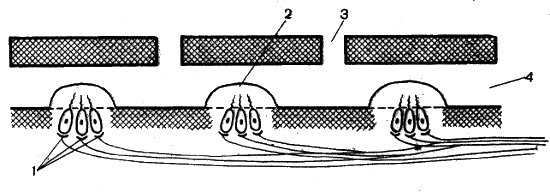 Рис. 61. Схема строения боковой линии: 1 — волосковые клетки (нейромасты); 2 — купула; 3 — пора; 4 — канал