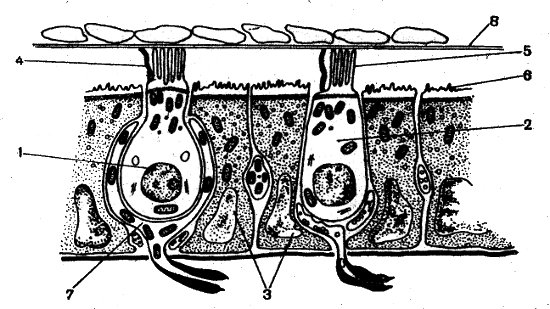 Рис. 62. Схема строения утрикулюса млекопитающих (Винников, 1966): 1 — рецепторная клетка первого типа; 2 — рецепторная клетка второго типа; 3 — опорные клетки; 4 — киноцилии; 5 — стереоцилий; 6 — микровилла; 7 — чашевидное нервное окончание; 8 — мембрана с известковыми телами (отолиты)