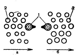 Рис. 63. Схема положения киноцилии (1) по отношению к пучку стереоцилий (2) (Lowenstein, 1964). Стрелками показано: а — возбуждающее направление наклона стереоцилий, б — тормозящее