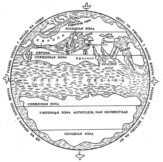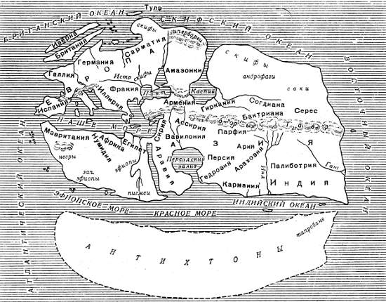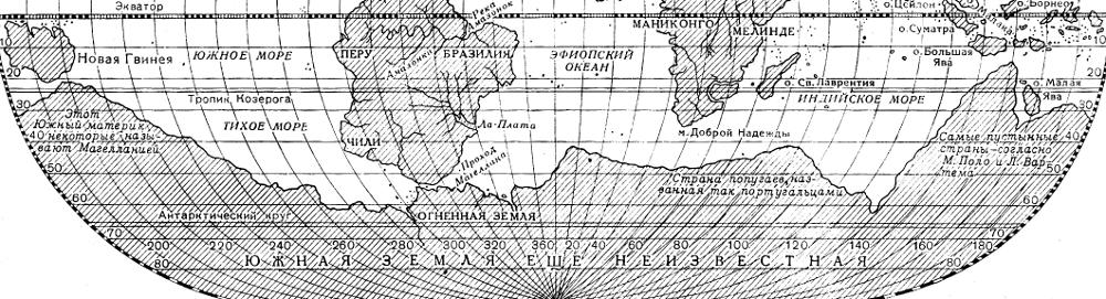 Неизвестная земля Птолемея — географическая нелепость. После путешествия Марко Поло в Европе отлично знали, что Земля синов — Южный Китай — нигде на юге не смыкается с птолемеевской Terra incognita, а после плавания Васко да Гамы стало ясно, что южная оконечность Африки омывается морем. В конце XV и в самом начале XVI в. в южном полушарии эта суша совершенно исчезла с карт. Ее нет ни на глобусе Мартина Бехайма (1492), ни на португальских картах того времени. Однако в XVI и XVII вв. птолемеевская перемычка, сорванная с окраины Азиатского и Африканского материков, появилась снова. Картографы эпохи великих открытий после 1515 г. создали в южном полушарии Неведомый Южный материк; опирались они при этом даже не столько на Птолемея, сколько на античных географов Помпония Мелу и Макробия. У Мелы и Макробия в соответствии с теориями единого Мирового океана и разделения Земли на поясы северной ойкумене — Азии, Европе и Африке — противопоставлялась примерно равная ей по площади южная, пока еще неведомая суша. У Мелы она называлась Землей антихтонов (противоживущих), у Макробия — Землей антиподов. Сравнительно узкая полоса моря разделяла эти два массива земной суши. У Макробия материки-антиподы, равновеликие друг другу, подразделены были на симметричные зоны: жаркую, холодную и умеренную.