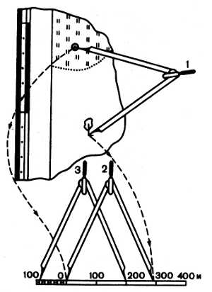 Для определения длины отрезка прямой между двумя точками в раствор циркуля-измерителя берут с карты заданный отрезок, переносят на линейный масштаб карты (как указано на рисунке 6) и получают длину линии, выраженную в поземельных мерах (метрах или километрах). Аналогичным образом измеряют длины ломаных линий, беря в раствор циркуля каждый отрезок отдельно и затем суммируя их длины. Измерения расстояний по кривым линиям (по дорогам, границам, рекам и т. п.) более сложны и менее точны. Очень плавные кривые измеряют как ломаные, разбив предварительно на прямолинейные отрезки. Извилистые линии измеряют малым постоянным раствором циркуля, переставляя его («шагая») по всем изгибам линии. Очевидно, что мелкоизвилистые линии следует измерять при весьма малом растворе циркуля (2—4 мм). Зная, какой длине на местности соответствует раствор циркуля, и подсчитав число его установок по всей линии, определяют общую ее длину. При этих измерениях применяют микроизмеритель или пружинный циркуль, раствор которого регулируется винтом, пропущенным через ножки циркуля.