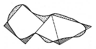 При измерении площади участка с прямолинейными границами делят участок на простые геометрические фигуры, измеряют площадь каждой из них геометрическим способом и, суммируя площади отдельных участков, вычисленных с учетом масштаба карты, получают общую площадь объекта. Объект с криволинейным контуром разбивают на геометрические фигуры, предварительно спрямив границы с таким расчетом, чтобы сумма отсеченных участков и сумма избытков взаимно компенсировали друг друга (рис. 8). Результаты измерений будут в некоторой степени приближенными.
