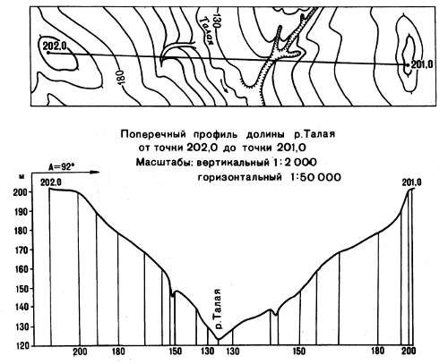 На горизонтальную ось последовательно переносят с карты расстояния от начальной точки профиля до горизонталей, пересекающих линию профиля, и из полученных точек восстанавливают перпендикуляры, длины которых соответствуют отметкам горизонталей на карте и на вертикальной оси. Концы перпендикуляров соединяют плавной кривой. Над линией профиля указывают его азимут, снятый с карты, название начальной и конечной точек профиля, его масштабы (рис. 39).