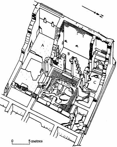 «Дом собраний» в Дура-Европос (Сирия) — первая изученная церковь христиан. Изометрия раскопанных частей. (Milburn, 1988). А — зала собраний; В — комната для обучения; С — часовня-баптистерий.