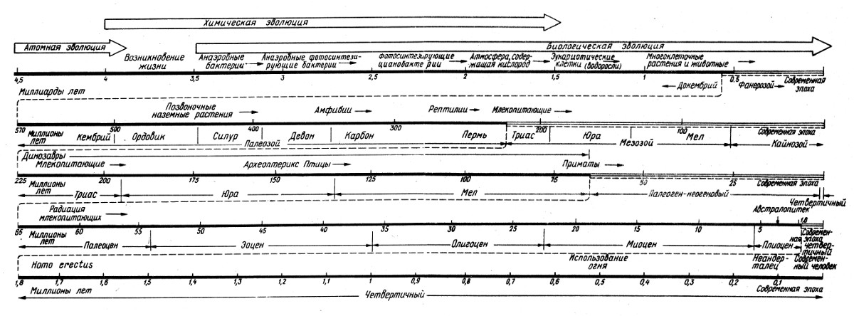 Рис. 1.1. Геохронологическая схема (по Э. Майру, 1981). Верхняя линия соответствует периоду времени от возникновения Земли до наших дней; вторая сверху линия — фанерозою, начавшемуся 570 млн. лет назад. На следующих трех линиях отражены более короткие периоды. Фанерозой делится на три эры (палеозой, мезозой и кайнозой), которые в свою очередь подразделяются на 11 периодов; палеоген-неогеновый период — на пять эпох, четвертичный — на плейстоцен и современную эпоху. Увеличить (в отдельном окне)