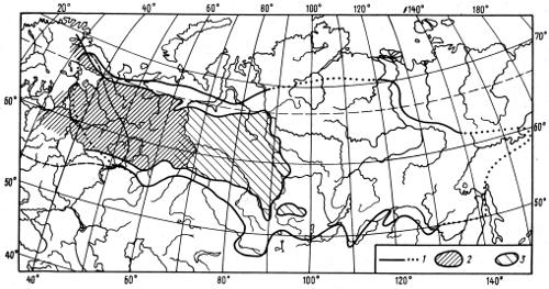Рис. 2.1. Ареал сибирской ели Picea obovata (по А. И. Толмачеву, 1974): 1 — граница ареала, 2 — пространство, в пределах которого сибирская ель является основным лесообразователем, 3 — область согосподства ели, пихты и кедра, на севере — ели и лиственницы