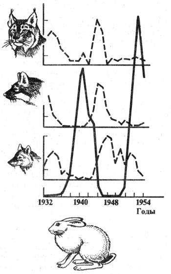 Рис. 2.10. Характер колебаний численности рыси Felis lynx, лисицы Vulpes vulpes, волка Canis lupus и зайца-беляка Lepus timidus на севере европейской части России (по А.В. Яблокову, А.Г. Юсуфову, 1989)