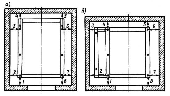 Рис. 2.1. Шаблоны для провески шахты лифта: а — для лифтов с противовесом сзади; б — для лифтов с противовесом сбоку