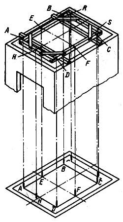 4) закрепление на углах шаблона четырех отвесов и стальной проволоки диаметром 1,2 мм и опускание их в приямок;