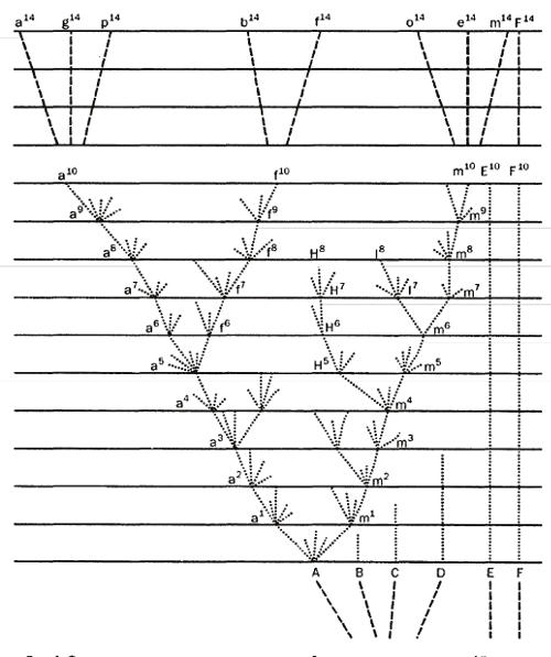 Воспроизводя самый важный фрагмент этой диаграммы (рис. 1), напомним, что на ней заглавными буквами А, В, С и далее обозначены родоначальные виды, строчными буквами с цифровыми индексами a1, a2,…, a10, a14 или m1, m2,…, m10, m14 и другими – степени изменчивости потомков родоначальных видов и последовательные ступени формирования рас, разновидностей, подвидов и видов. Каждая горизонтальная линия отделяет промежутки времени, соответствующие тысяче поколений. На диаграмме процесс дивергенции от вида А завершается образованием через 14 тыс. поколений формированием видов, обозначенных буквами от a14 до m14. В совокупности с видами другой части диаграммы они образуют новый род.