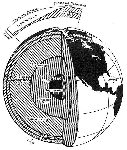 Хотя, строго говоря, мы исследовали лишь самую поверхностную часть планеты, мы все же имеем грубую модель ее внутреннего строения. Эта модель, которая год от года уточняется, явилась главным образом результатом обширных и координированных между собой исследований, проводящихся во всем мире,– исследований путей и скорости перемещения сейсмических волн, этих надежных посланцев, которые проникают дальше и быстрее в земные недра, чем буровые скважины. Данные сейсмических исследований дополняются другими, как, например, изучение свойств пород па поверхности Земли и в условиях больших температур и давлений. Конечно, в деталях наша модель неточна, но вероятность того, что она правильна в общих чертах, достаточно велика. Рисунок (рис. 1), представляющий модель в упрощенной форме, изображает планету как бы состоящей из концентрических оболочек-слоев, подобно луковице, причем каждый нижележащий слой тяжелее, чем вышележащий.