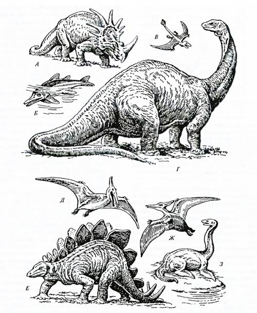 Рис. 5.10. Некоторые пресмыкающиеся мезозоя: А – рогатый динозавр; Б – ихтиозавр, В – летающий хвостатый ящер; Г – бронтозавр; Д, Ж – летающие 6есхвостые ящеры; Е – стегозавр; З – плезиозавр (по данным разных авторов из Д.К. Беляева и др., 1967)