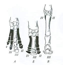 Рис. 6.20. Сравнительно-анатомический ряд: А – передние конечности тапира (Tapirus), Б – носорога (Ceratotherium); В – лошади (Equus); II–V– пальцы (из Д.К. Беляева и др., 1967)