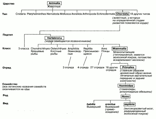 Рис. 2.1. Пример иерархии таксономических групп. Показаны не все группы животных. На схеме приводятся и латинские, и принятые русские названия.