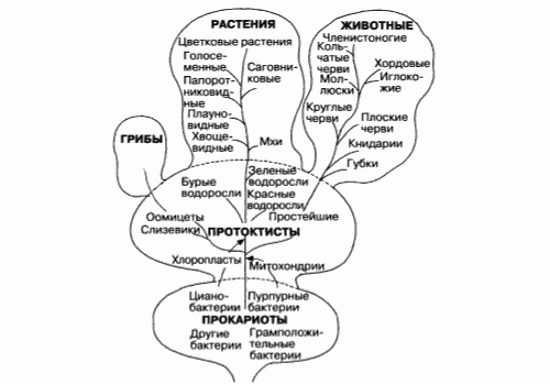 Рис. 2.3. Эволюционное древо жизни, охватывающее пять царств по классификации Маргелиса и Шварца (разд. 2.2). Длина линий не отражает продолжительности соответствующего периода.