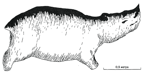Открытые в 1935 г. остатки носорога представляли собой небольшую полость в теле лавового потока, имевшую форму раздувшегося трупа носорога (рис. 33); в этой полости находились челюсть, зубы и другие кости животного. Для изучения формы тела носорога был сделан гипсовый слепок полости.