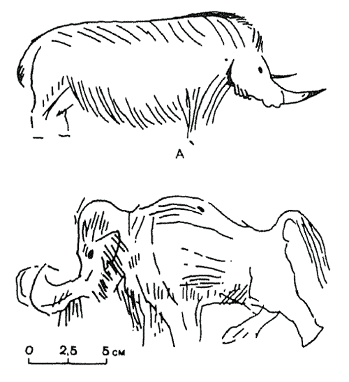 Вверху шерстистый носорог. Внизу найденное в Западной Франции изображение нападающего мамонта, вырезанное на куске клыка 10 000-16 000 лет назад. Художник не вырезал до конца клыки, хобот и передние ноги.