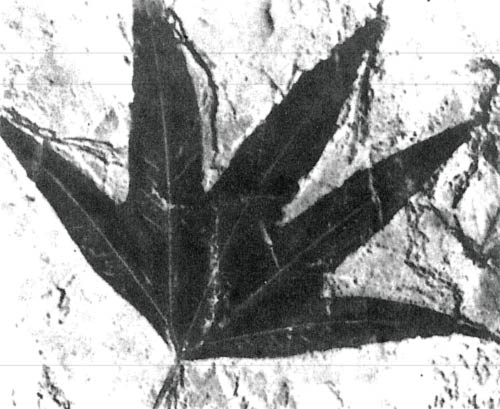Фото 16. Отпечаток листа платана в эоценовых алевролитах, штат Юта. Сам лист разрушен; темный цвет объясняется наличием минерального вещества, отложенного грунтовыми водами во время превращения первичного осадка в горную породу.