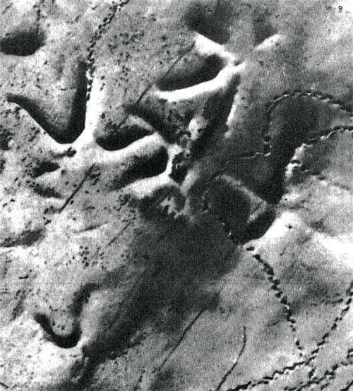 Еще один вид ископаемых остатков, никогда не содержавших органического вещества, - это отпечатки следов (фото 17). Из них сохраняются только те следы, которые были перекрыты тонкими отложениями, прежде чем их успела разрушить эрозия. Иногда даже крохотные следы мелких насекомых (фото 18), а также отпечатки дождевых капель сохраняются очень отчетливо. Такие отпечатки не просто редкость. Они содержат информацию о размере животного, длине конечностей, наличии когтей, копыт и т.д., а также о том, как передвигалось это животное - тягами, бегом иди прыжками. Другой, на первый взгляд странный, но надежный источник сведений - это окаменевшие экскременты животных. Изучение их тонких срезов под микроскопом помогает определить, какую пищу употребляли животные, и неопровержимо свидетельствует о том, что некоторые из них были каннибалами. Они питались животными того же вида.