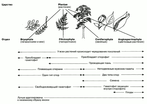 Рис. 2.33. Систематика растений и некоторые основные тенденции в эволюции растений.