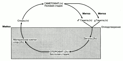 Как у всех наземных растений и некоторых наи­более высоко организованных водорослей, та­ких как ламинария, у мохообразных наблюдает­ся чередование поколений. В ходе жизненного цикла происходит смена двух типов организмов: поколение гаплоидного гаметофита и поколе­ние диплоидного спорофита поочередно сменя­ют друг друга, что схематически показано на рис. 2.34. Гаплидное поколение называется гаметофитом (от греч. gamete – жена, gametes – муж; phylon – растение), так как оно способно к половому размножению и образует гаметы. По­скольку образование гамет происходит в резуль­тате митоза, они тоже гаплоидны. Сливаясь, га­меты образуют диплоидную зиготу, из которой вырастает следующее поколение – поколение диплоидных спорофитов. Они называются спо­рофитами, потому что способны к бесполому размножению с образованием спор. Споры об­разуются в результате мейоза, т.е. здесь проис­ходит возврат к гаплоидному состоянию. Гаплоидные споры дают начало гаметофитному поко­лению. Одно из этих двух поколений всегда пре­обладает над другим, и на его долю приходится большая часть жизненного цикла; это поколе­ние называют доминантным. У моховидных до­минирует поколение гаметофитов, у всех ос­тальных наземных растений – поколение спо­рофитов. Доминирующее поколение принято помещать в верхнюю половину схемы, изобра­жающей жизненный цикл.