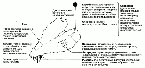 Рис. 2.35. Внешние признаки Pellia (печеночника). Гаметофит изображен вместе с прикрепленным к нему несамо­стоятельным спорофитом.