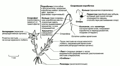 Споры образуются на спорофите в споровой коробочке, расположенной на конце тонкой ножки, возвышающейся над гаметофитом