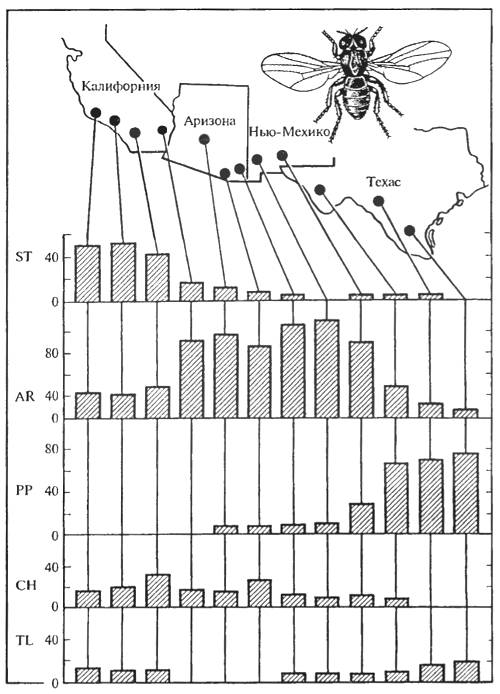 Рис. 8.2. Распространение хромосомных мутаций (инверсий ST, AR, PP, CH и TL) в популяциях Drosophila pseudoobscura на западе США (по Ф.Г. Добржанскому, 1970)