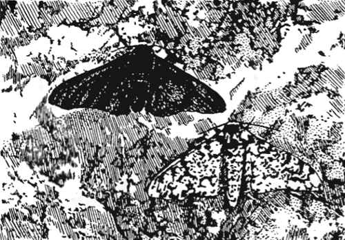 Рис. 10.4. Типичная (светлая) форма березовой пяденицы (Biston betularia), малозаметная на светлой коре дерева, тогда как меланистическая форма заметна хорошо (из Г. Стеббинса, 1966)