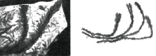Фото 23. А. Древнейшее из известных нам наземных растений. Ископаемый отпечаток растения рода Baragwanathia в нижнедевонских слоях юго-восточной Австралии. Б. Близкородственное ему современное растение, плаун Lycopodium lucidulum с побегами длиной 10-12 см.