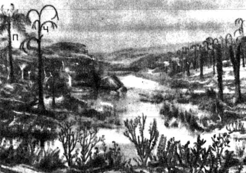 Фото 25. Реконструкция ландшафта позднедевонского времени, на котором показаны настоящие папоротники (П), примитивные лепидодендроны - «чешуйчатые деревья» (Ч) и меньшие по размеру растения.