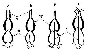 Рис. 16.1. Схема эволюции сердца позвоночных. Пример усиления главной функции органа посредством ароморфозов. А — двухкамерное сердце рыб; Б — трехкамерное сердце амфибий; В — четырехкамерное сердце рептилий (с еще не вполне разделенными желудочками, но разделенными предсердиями); Г — четырехкамерное сердце крокодилов, птиц, млекопитающих; art — предсердие; s — перегородка; vt — желудочек; a — аорта (из А.Н. Северцова, 1936)