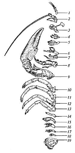 Рис. 16.2. Дифференциация конечностей речного рака (Astacus leptodactylus), связанная с разделением и сменой функций (из И.И. Шмальгаузена, 1969): 1—2 — органы чувств; 3—5 — челюсти; 6—8 — ногочелюсти; 9—13 — ходильные ноги; 14—18 — брюшные ноги (спаривание и удержание яиц); 19 — хвостовая нога (плавник)