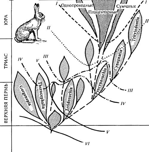 И только после того как эти признаки, возникшие в разное время и у разных групп, объединились в одной из переходных между рептилиями и млекопитающими группе, выделилась новая группа позвоночных — класс млекопитающих.