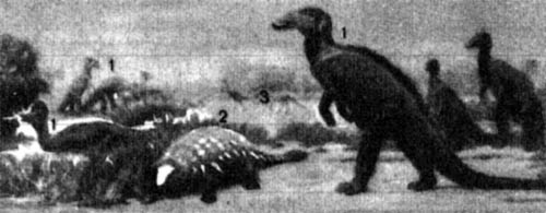 Фото 43. Гадрозавры (1), «бронированный» динозавр, подобный анкилозавру, (?) и плотоядный динозавр Struthiomimus (3). Дерево слева относится к попокрытосеменным. Реконструкция.