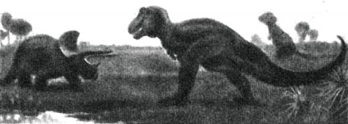 Фото 44. Тираннозавр, самый крупный хищник, нападает на трицератопса, который приготовился к защите. Голова трицератопса покрыта панцирным шлемом. Деревья представляют собой пальмы, относящиеся к покрытосеменным растениям. Реконструкция.