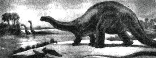 Земноводные четвероногие. Перейдем к гигантским динозаврам, которые так часто описываются в популярной литературе, что их облик знаком не только ученым. В палеонтологической летописи имеются данные по крайней мере о четырех различных родах, внешне очень похожих; мы упомянем только двух из них. На первый взгляд может показаться странным, что, хотя динозавры из этих двух родов были четвероногими, передние ноги у них были гораздо короче задних. Но в действительности этого можно было ожидать, потому что они были потомками триасовых двуногих динозавров с короткими передними конечностями. Пожалуй, лучше всего известен род Apatosaurus (фото 45) - огромные малоподвижные травоядные, достигавшие 23 метров в длину; их короткое туловище поддерживалось массивными колоннообразными ногами, снабженными когтями. Впереди находилась длинная гибкая шея с маленькой головой, которую в задней части туловища уравновешивал длинный гибкий хвост, сужающийся к концу. Животное должно было весить более 30 тонн, то есть вчетверо или впятеро больше самого большого африканского слона.