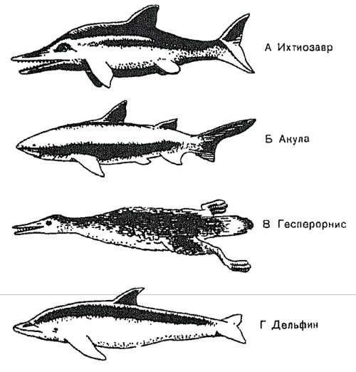 Рис. 50. Четыре группы животных, которые приобрели обтекаемую форму тела в результате приспособления к жизни в воде: А. рептилия, Б. рыба, В. птица, Г. млекопитающее. Первоначально они имели различный облик, но в ходе эволюции приобрели внешнее сходство.
