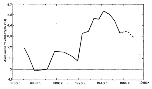 Климат после 1800 г. Данные измерений температур, производившихся правительственными учреждениями в большинстве стран, показывают изменения температур с начала XIX в. В самом общем виде эти изменения приведены на кривой рисунка 64. Она свидетельствует о том, что за последние сто лет средние годовые температуры увеличивались более чем на полградуса Цельсия, причем это увеличение шло неравномерно. Оно затронуло большую часть планеты, как тропические, так и высокие широты, как северное, так и южное полушарие. Затем, после 1940 г., начался период похолодания. Температуры понизились, и к 1970 г. достигли того уровня, который наблюдался около 1920 г. Таким образом, устанавливается тот факт, что климаты Земли не являются чем-то постоянным и неизменным, но подвергаются существенным изменениям. Теплые зимы и жаркие летние сезоны, отмечавшиеся в 30-х годах двадцатого века на западе США, представляются частью общего потепления климата, проявлявшегося в широких масштабах.