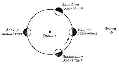 Так как в этой книге мы будем говорить почти исключительно о физических характеристиках Венеры, мы не собираемся давать полного разбора ее движений, но кое-что следует сказать о фазах, наблюдаемых как у Венеры, так и у другой внутренней планеты — Меркурия.