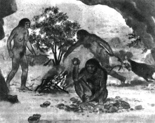 Фото 66. Реконструкция внешнего вида группы Homo erectus, который жил, вероятно, 500 0Q0 лет назад. Мужчина сидит у входа в пещеру, изготовляя грубые орудия из камня. Другой тащит оленя, которого он убил, а женщина собирается приготовить мясо.